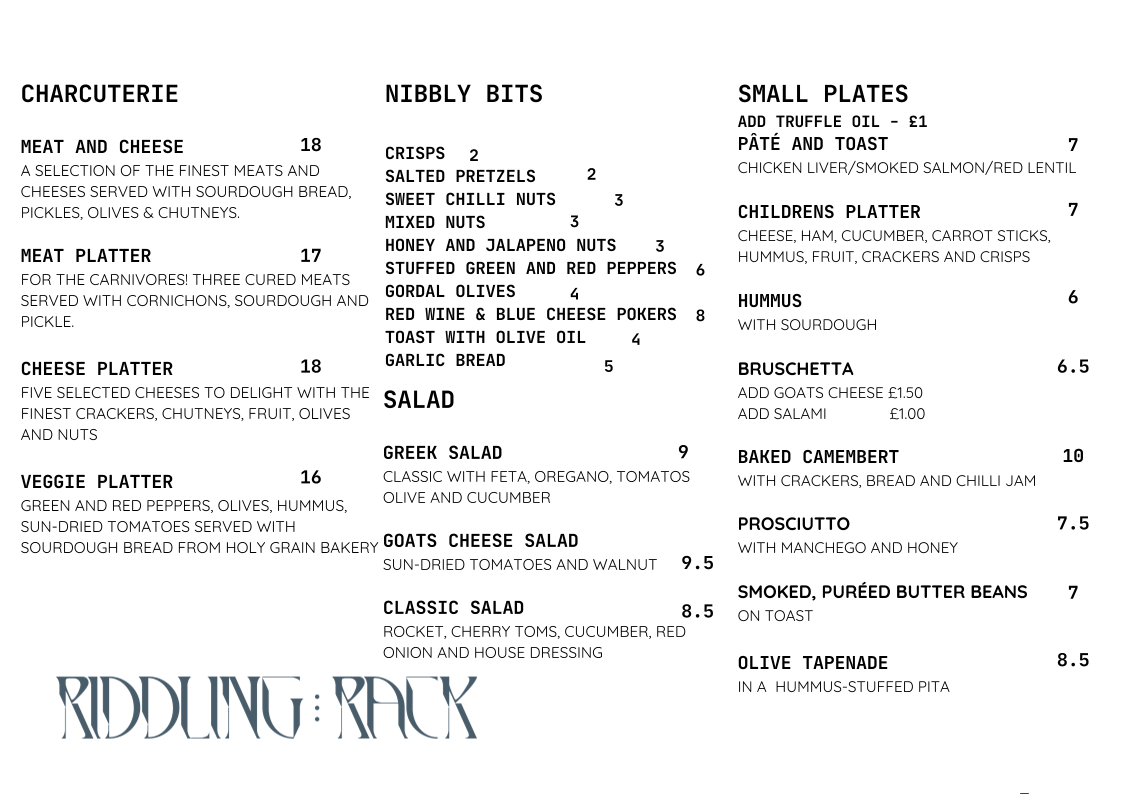 The menu at Riddling Rack in Newton-le-Willows offers a delightful variety of options for any taste, from light nibbles to hearty meals. Starting with the Charcuterie section, diners can indulge in platters such as the Meat and Cheese or the more vegetarian-friendly Veggie Platter. For those seeking smaller bites, the Nibbly Bits category features snacks like Crisps and Salted Pretzels, along with more adventurous options like Honey and Jalapeno Nuts.